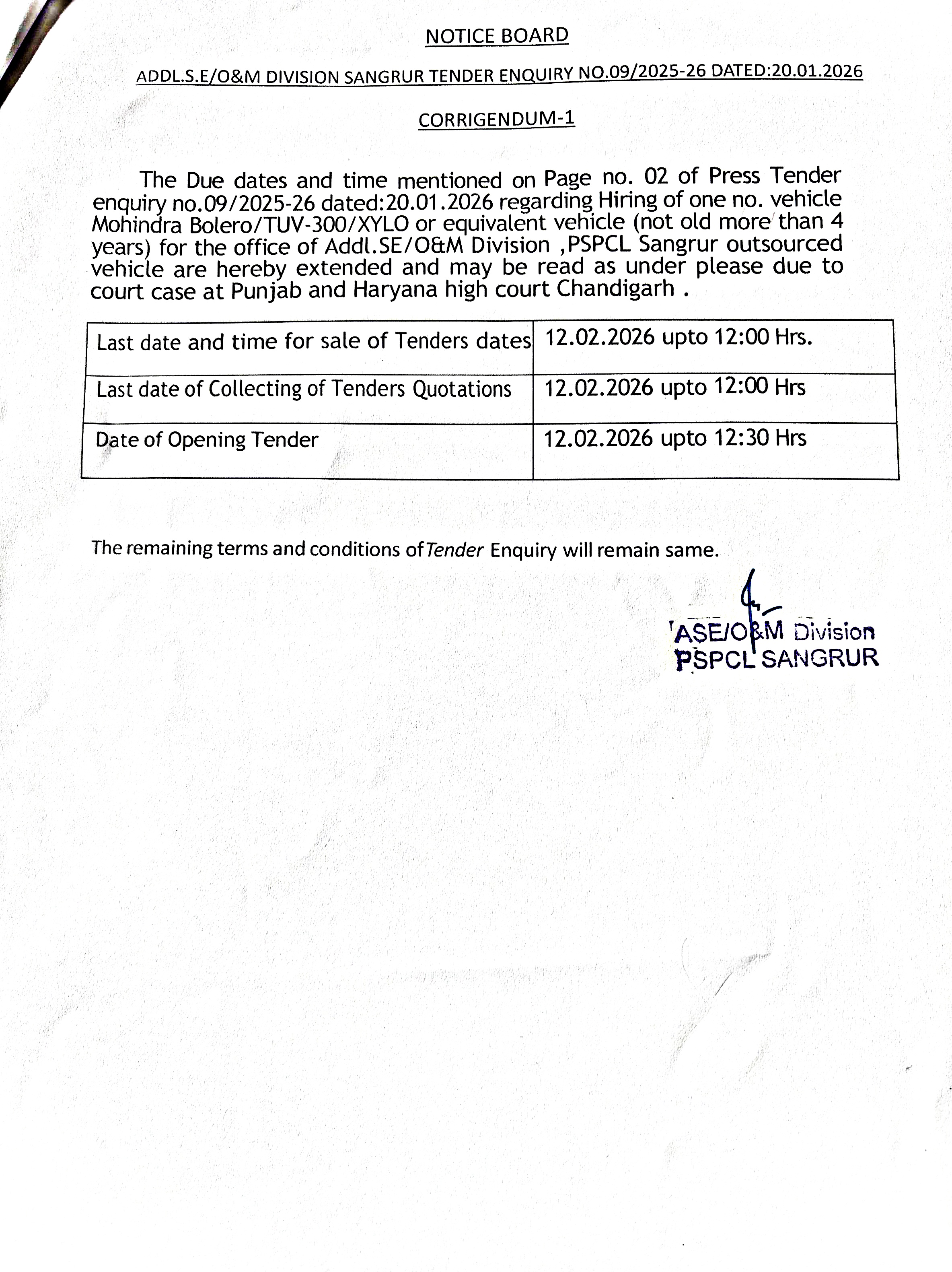 addl/SE Operation. Sub Urban Divison. Amritsar invite tender for hring of One no. vehicle (Mohindra Bolero Double Door/TUV 330/Xylo or equivalent in price) for the office ADDL/SE OPeration Sub Urban Division Amrisar For one year ( the vehicle Should not be more then 4 Years old)